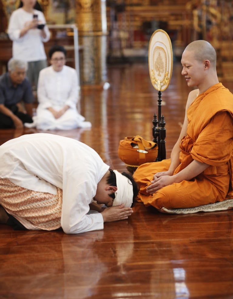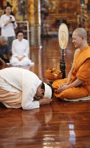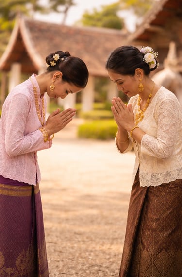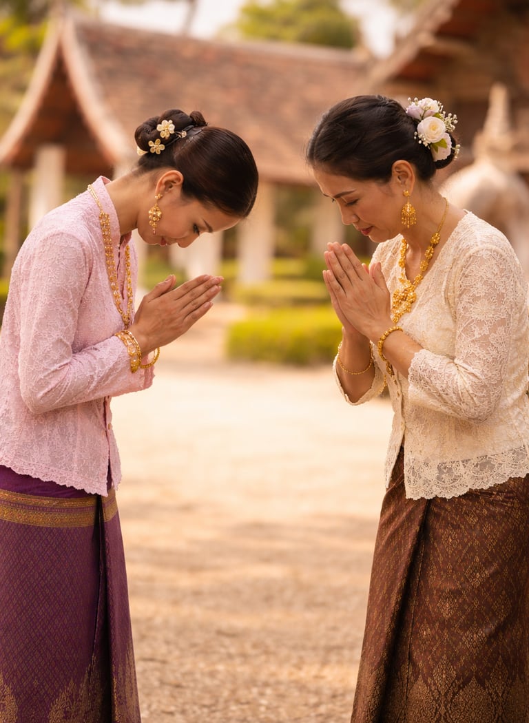 ✨ Curiosità: durante le cerimonie i devoti si inginocchiano davanti ai monaci, si portano le mani alla fronte e l'inchino è profondo fino a toccare il pavimento; davanti alle immagini del Buddha il rito si ripete per tre volte. I monaci non ricambiano il wai, perché il loro status religioso è superiore.